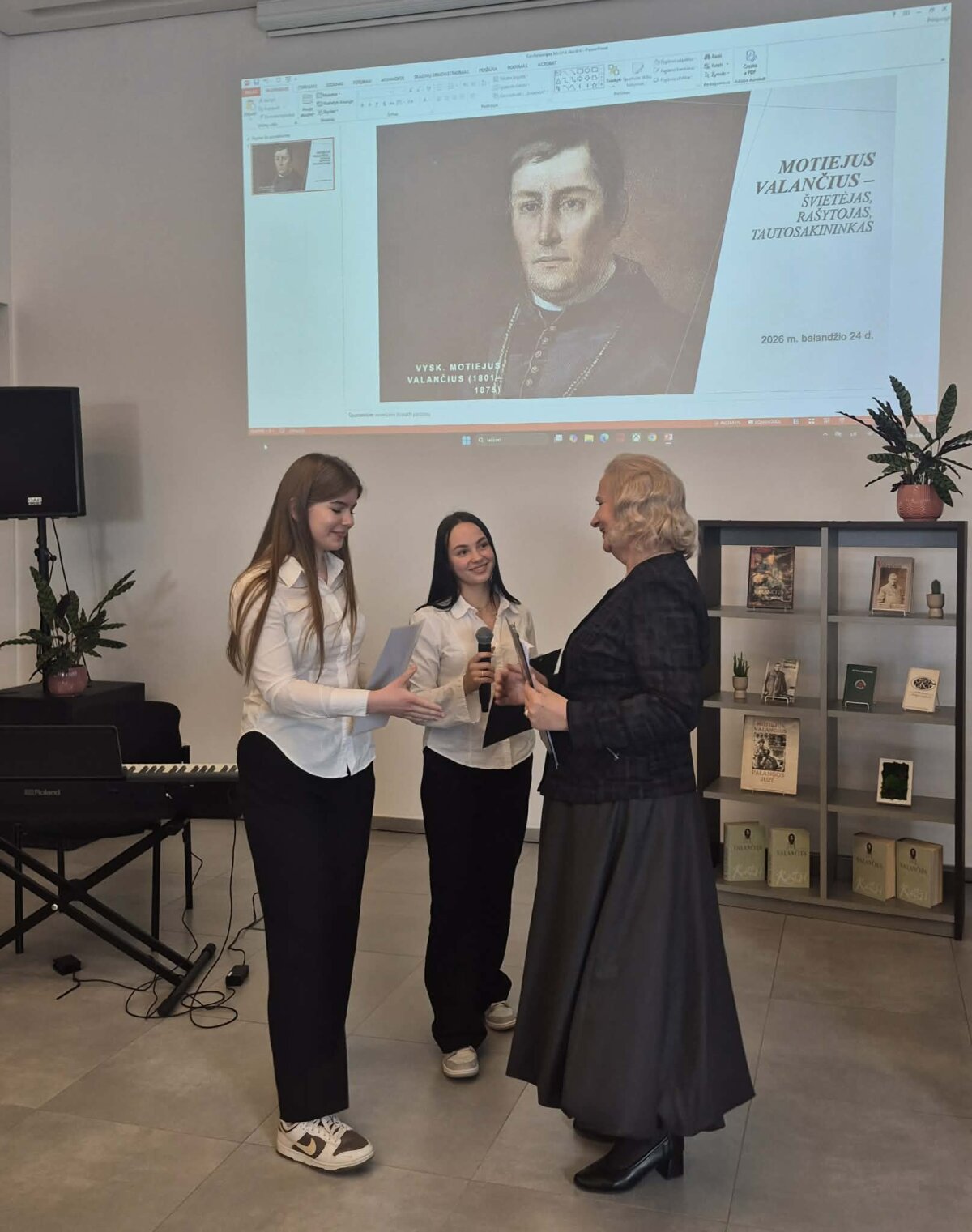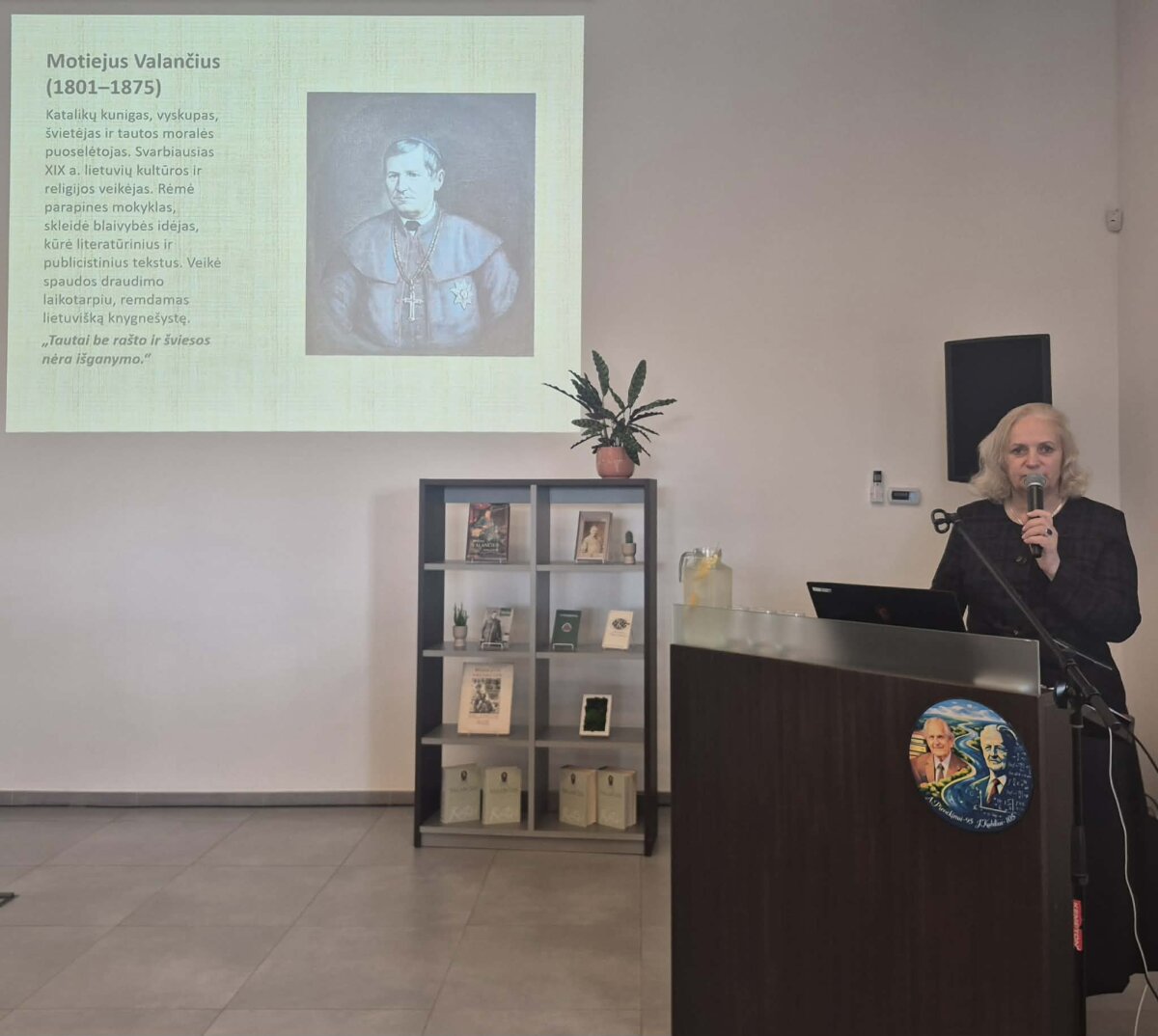 Pedagogė kalbėjo apie gimnazijos pirmokams parengtą pamoką, kurią vedė kartu su istorijos mokytoja Asta Urbaitiene, todėl švietėją Motiejų Valančių pristatė ir kaip literatūros kūrėją, ir kaip istorijai svarbų asmenį.