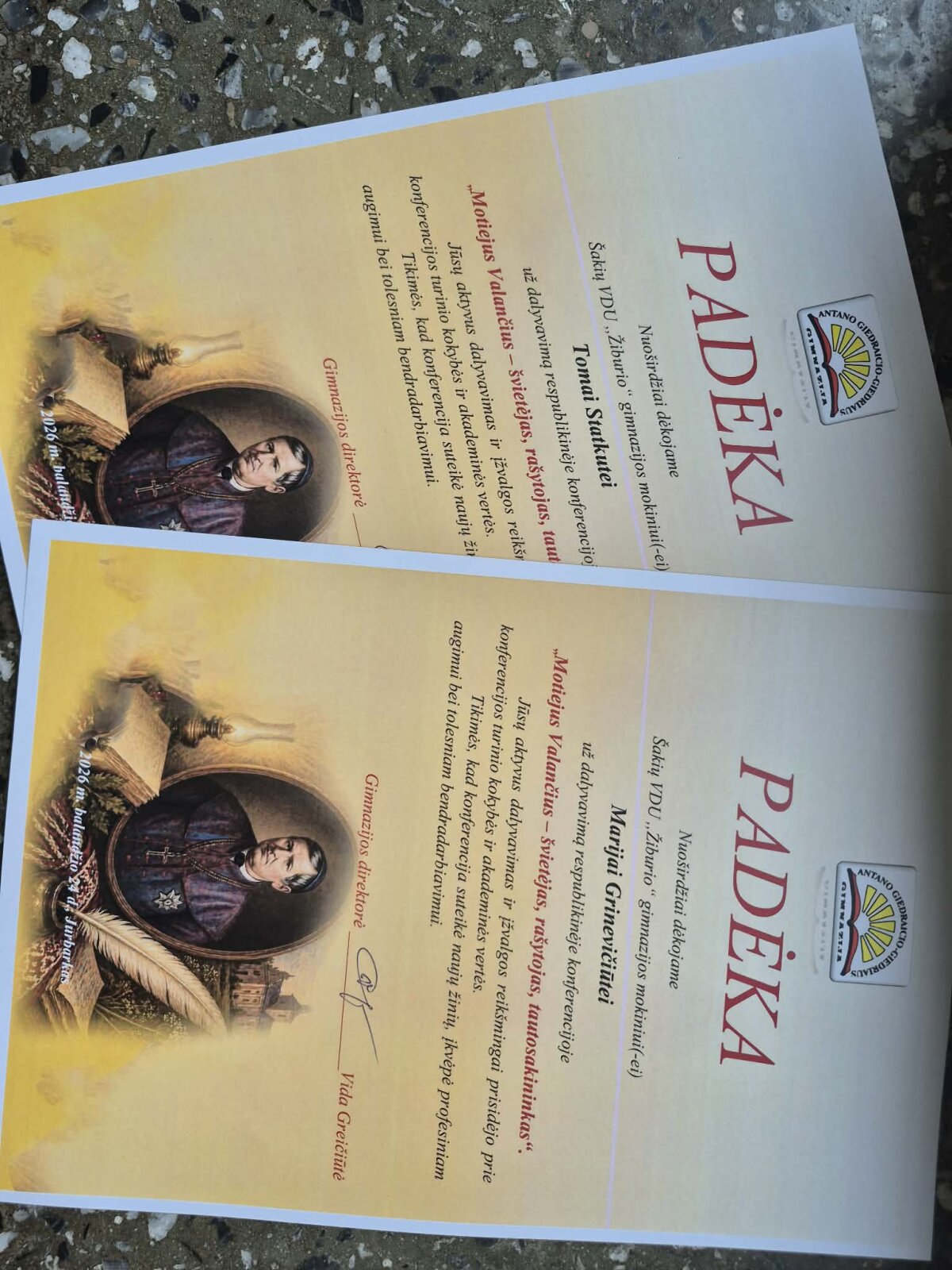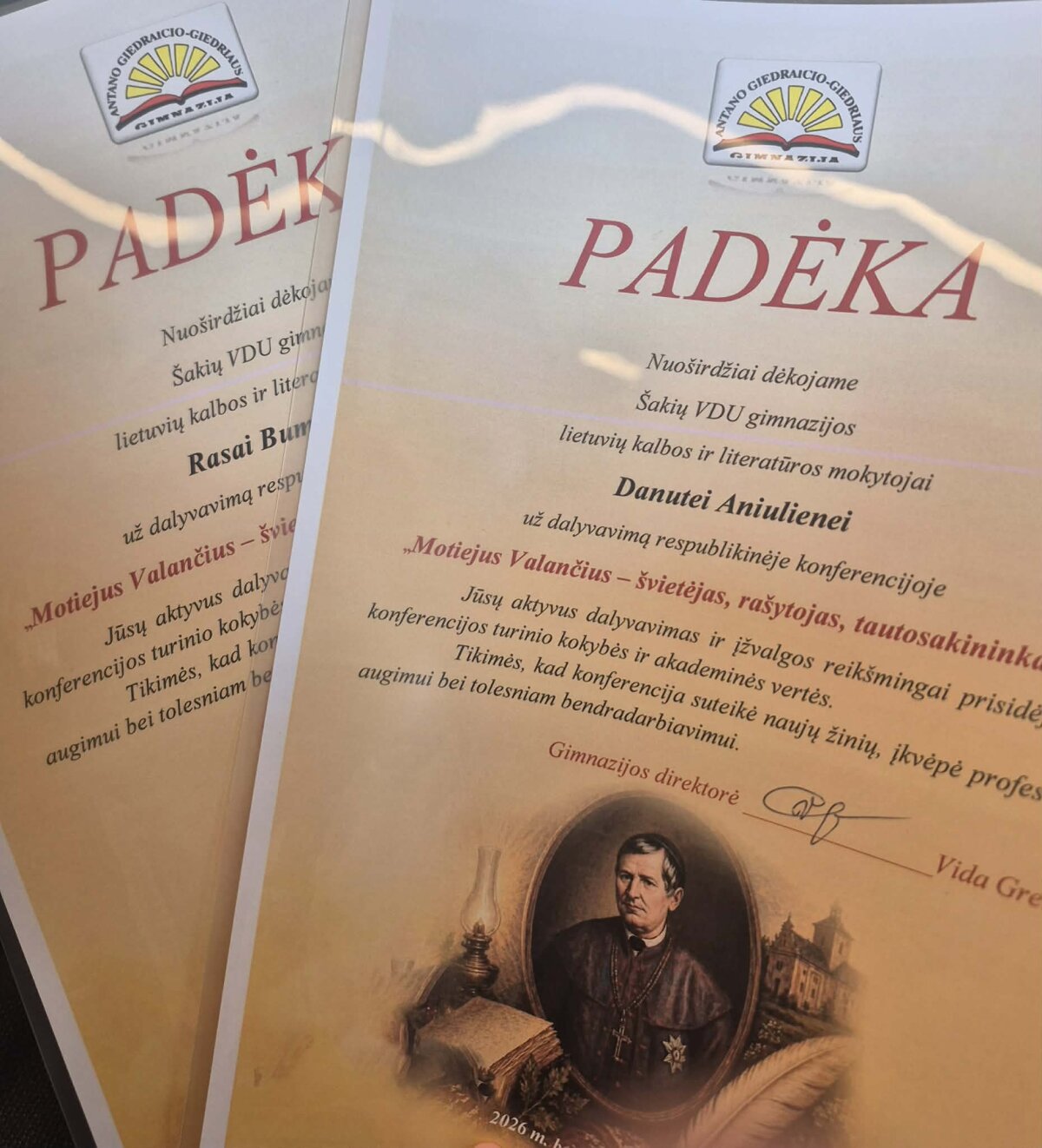 Balandžio 24 dieną VDU Šakių ,,Žiburio" gimnazijos 1a klasės mokinės Marija Grinevičiūtė ir Toma Statkutė dalyvavo Jurbarko Antano Giedraičio - Giedriaus gimnazijos organizuotoje konferencijoje ,,Motiejus Valančius - švietėjas, rašytojas, tautosakininkas", skirtoje visuomenininko 225-osioms gimimo metinėms paminėti.