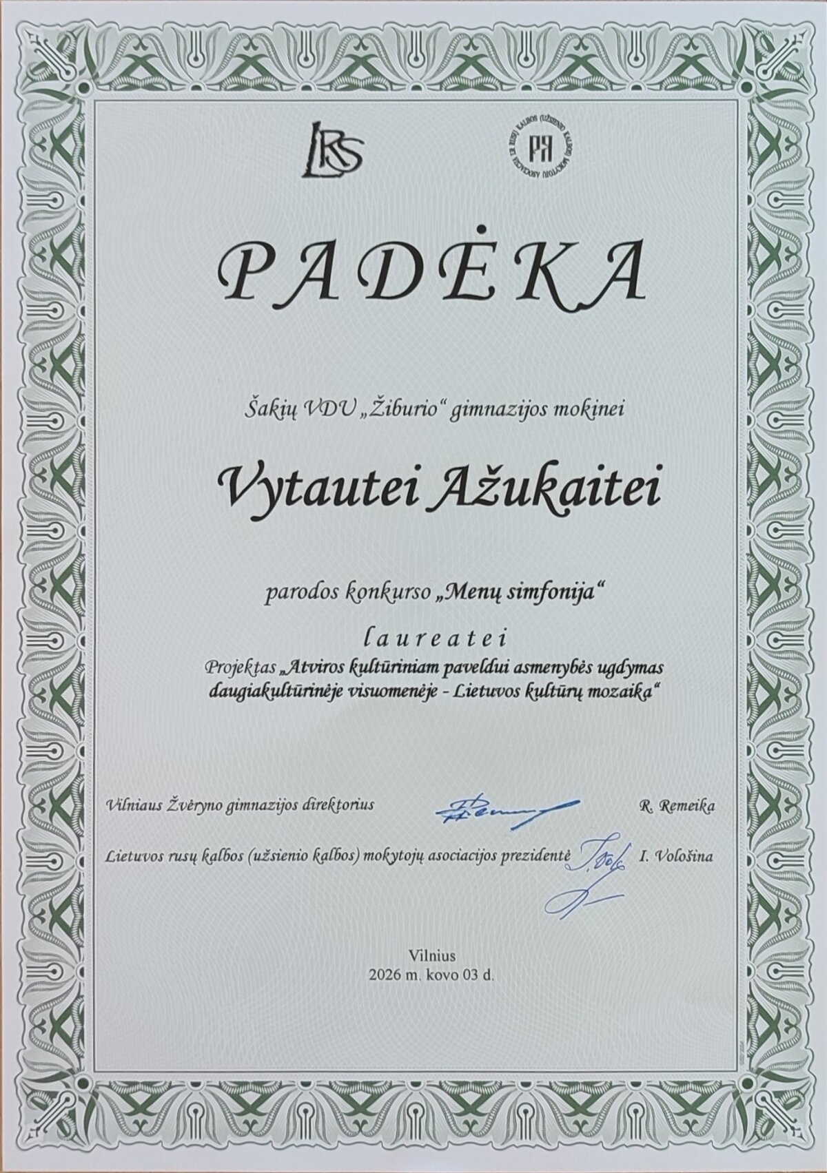 1 a klasės mokinė Vytautė Ažukaitė dalyvavo šalies projekto „Atviros kultūriniam paveldui asmenybės ugdymas daugiakultūrinėje visuomenėje. Lietuvos kultūrų mozaika“ moksleivių kūrybinių darbų parodoje-konkurse „Menų simfonija“ ir tapo šio konkurso laureate. Savo tapybos darbu Vytautė iliustravo M.K.Čiurlionio prozos kūrinį „Pasaka“.