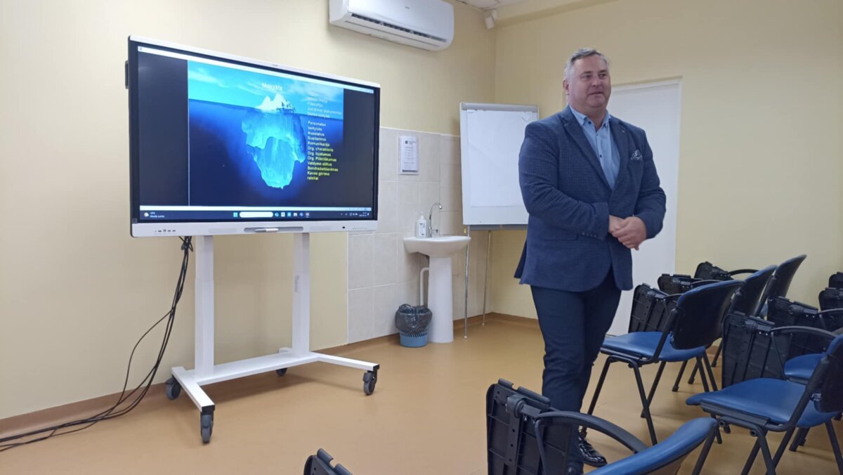 Pagal TŪM ilgalaikės programos „Mokinių kultūrinės kompetencijos plėtojimas netradicinėse ugdymosi aplinkose“, patvirtintos Šakių ŠPT, I modulį „Organizacinės kultūros vizija švietimo institucijose“ buvo numatyta nuvykti į Kretingos Jurgio Pabrėžos universitetinę gimnaziją ir susitikti su lektoriumi Kęstučiu Trakšeliu, direktoriumi. Jis įsitikinęs, kad mokykla kaip institucija – tai ledkalnis. Virš vandens – simboliai, tikslai, misija, vizija, filosofija, juridiniai dokumentai, darbo kokybė, o po vandeniu personalas, vertybės, nuostatos, susitarimai, komunikacija, charakteris, lojalumas, pilietiškumas, valdymo stilius, bendradarbiavimas, net ir kavos gėrimo rateliai. Direktorius ne kartą pabrėžė, kad mokykla turi būti saugi vieta kiekvienam vaikui. Pranešimas, pabendravimas su direktoriumi ir mokytojais, patalpų apžiūrėjimas paliko didelį įspūdį. Apžiūrint, diskutuojant kilo daug įdomių minčių apie autokratinį ir demokratinį valdymą, apie darbo organizavimą, apie laboratorijų būtinybę ir dar apie daug ką. Įspūdį paliko biblioteka ant sienos – nupieštos knygos su QR kodais, vienuolio ir gamtininko Jurgio Pabrėžos vaistažolių lysvės vidiniame kieme ir jo paveikslas sieniniame pano, sensorinis kabinetas ir mintis vesti edukacijas rajono darželinukams ir pradinukams.