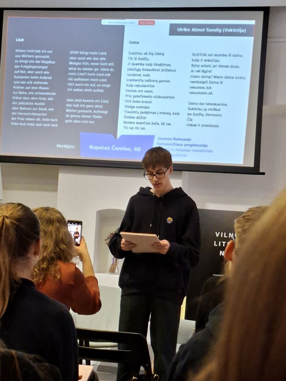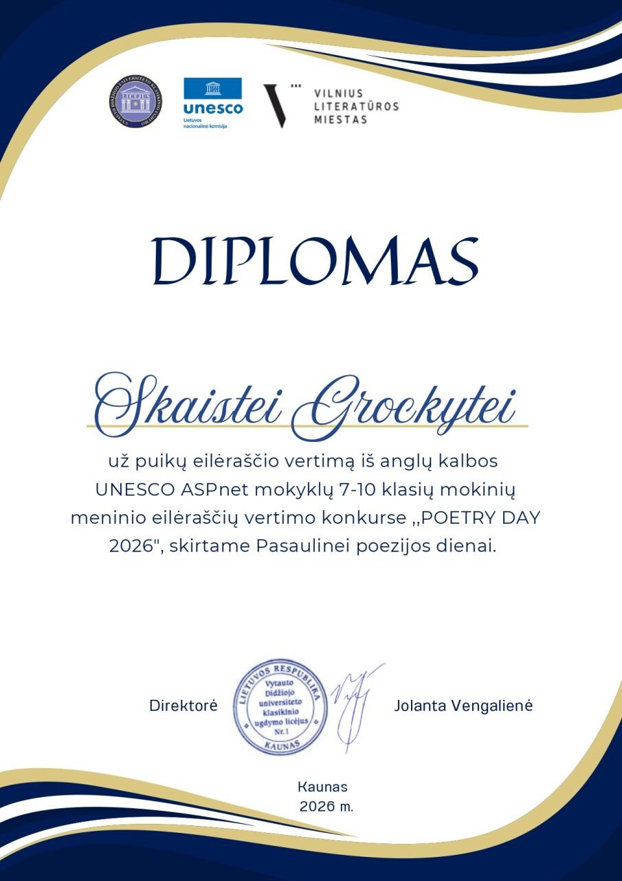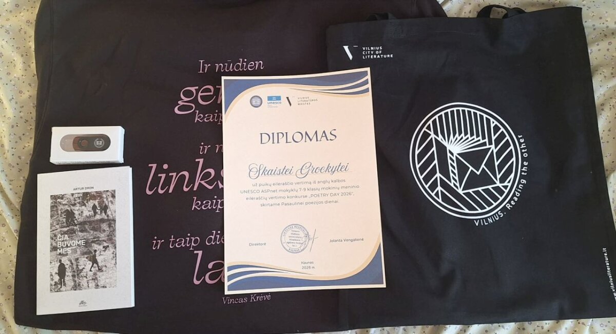 Ją šįkart paminėjome Vilniuje Literatų namuose vykusiame baigiamajame konkurso “Poetry Day 2026” renginyje. Čia ne tik susipažinome su šių metų autoriais ir prisiminėme jų kūrinius, bet ir sulaukėme padėkų už ryžtą ir norą versti iš skirtingų užsienio kalbų. Ypatingai džiaugiamės, kad Skaistės Grockytės vertimas šįkart sužavėjo konkurso rengėjus ir ji pateko į nugalėtojų sąrašą. Nelauktas ir netikėtas merginai buvo ir prašymas perskaityti savo vertimą visai auditorijai.