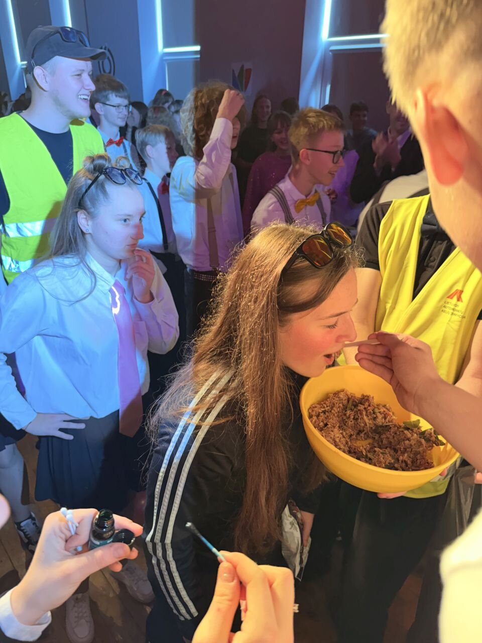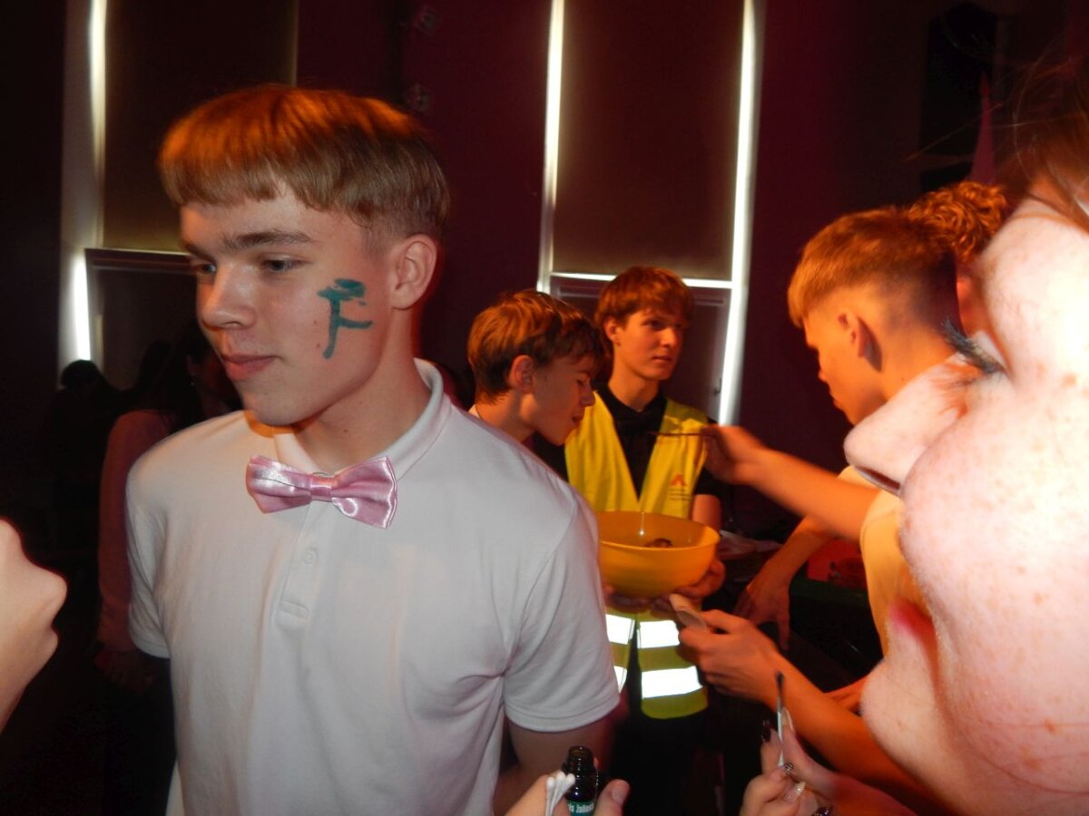 Šventė buvo tikrai nuostabi, tik truputį trumpoka (bent jau taip įsijautusiems mums - pirmokėliams - pasirodė). Renginio metu ant scenos lipo ir antrokai, kurie suruošė ne vieną įstabų šou. Mes taip pat gavome šansą parodyti savo sunkiai kurtus ir atidirbtus pasirodymus, kurie tikrai visus sužavėjo. Vaidinimams pasibaigus, atlikome keletą mums paskirtų smagių užduočių. Neapsiėjome ir be tradicijų: priesaikos davimo ir košės ragavimo. Pirmiausia visi pirmokai buvome suklupdyti ir kartojome priesaikos žodžius, o tada atėjo ir kulminacija - ragavome košę, kurią mums gamino antrokai. Visi pirmokai sustojo į eilutes ir su baime akyse laukė savo eilės. Paragavus košės ant veidų buvo nupieštos F raidės – reiškiančios, kad mes jau fuksai.