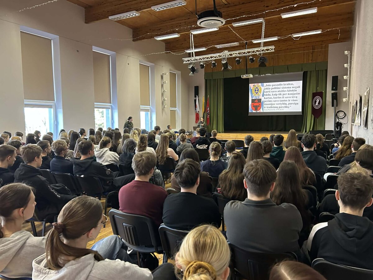 Šiandien pirmokai pradėjo Pilietiškumo ir gynybos įgūdžių kursą su KASP Dainavos apygardos I-osios rinktinės, PKT kariais, LŠS Sualkijos šaulių 4-osios rinktinės šauliais bei buvusia mūsų gimnaziste, dabar JKVM kursante Kamile.