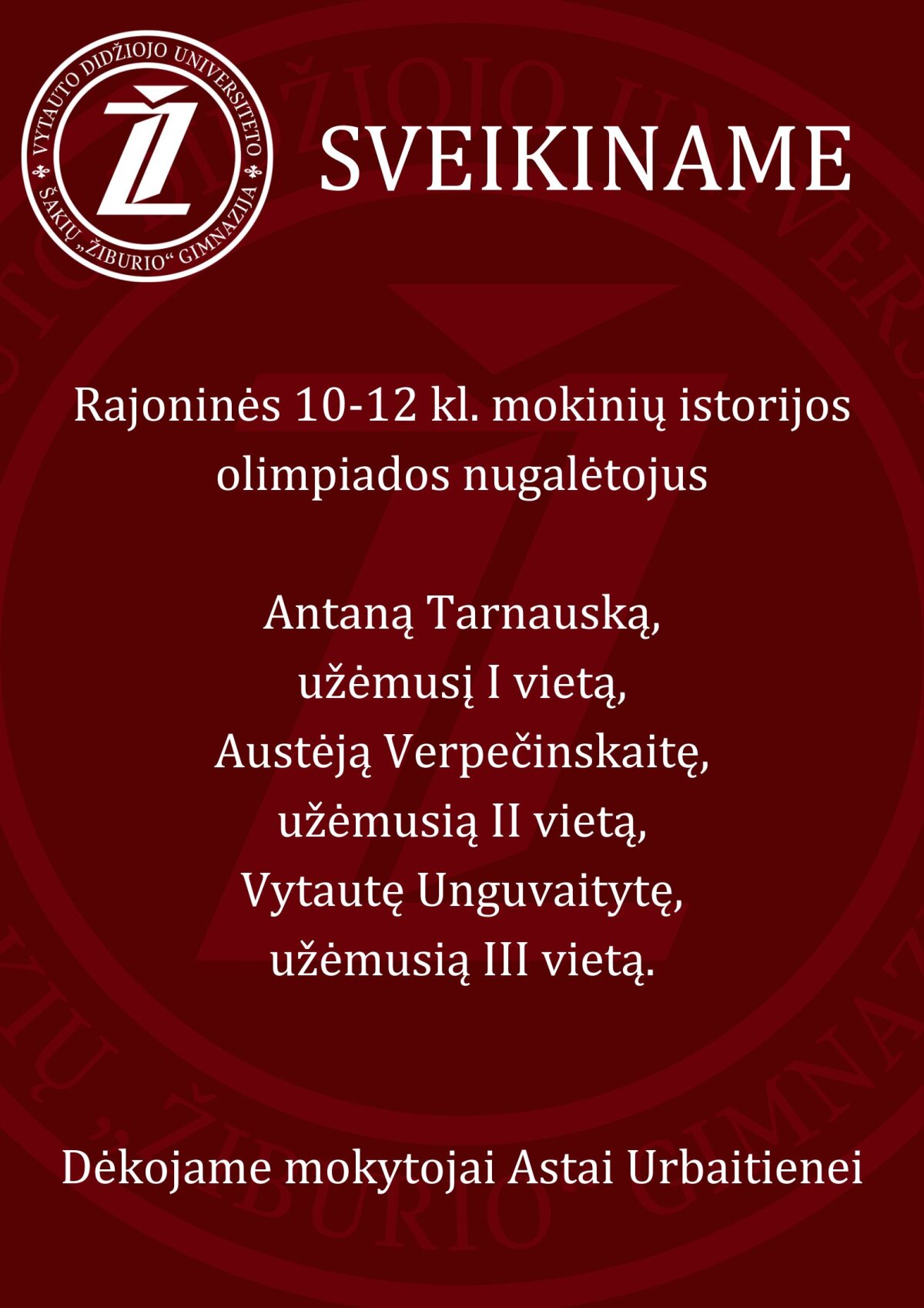 Sveikiname rajoninės 10-12 kl. mokinių istorijos olimpiados nugalėtojus